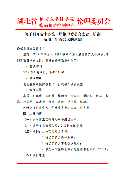 关于召开院中心第三届伦理委员会成立、培训及项目审查会议的通知