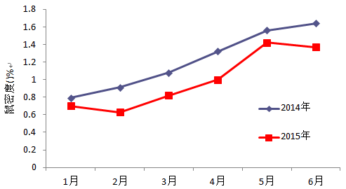 在居民区、特殊行业和农村自然村等不同环境类型设点开展鼠密度监测,20151-6月份我省鼠密度在0.63%~1.42%范围内,月平均鼠密度为0.99%。上半年监测结果显示,1-6月份我省鼠密度呈稳步上升趋势。2015年整体密度均低于2014年。具体见图1.