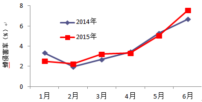 5  全省2014年和20151-6月蟑平均侵害率季节消长趋势