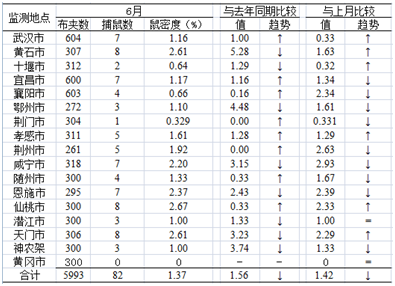 本月鼠密度监测结果显示,仙桃市最高(2.67%),其次是黄石市和天门市(2.61%)。本月与去年同期及上月各市(州)鼠密度监测结果比较情况见表5