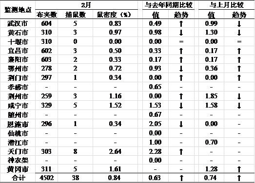 本月鼠密度监测结果显示,天门市最高(2.64%),其次是黄冈市。本月与去年同期及上月各市(州)鼠密度监测结果比较情况见表3。