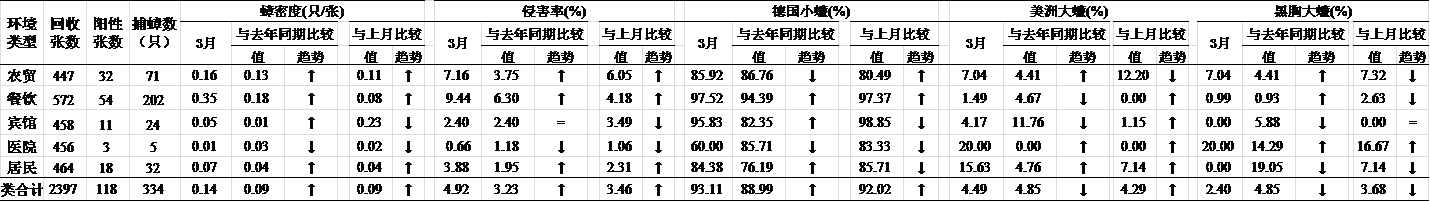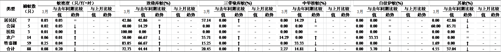 本月病媒生物监测结果显示,全省鼠平均密度为1.27%,与上月及去年同期相比均有所升高;所捕获鼠以小家鼠为主。全省蟑平均密度为0.14只/张,平均侵害率4.92%,与上月及去年同期相比均有所升高;所捕获蟑以德国小蠊为主。3月全省开始本年度首次蚊、蝇密度监测,当月监测蚊平均密度为0.08只/灯•时,与去年同期相比有所下降,所捕获蚊以致倦库蚊为主;蝇平均密度为0.18只/笼,与去年同期相比有所下降,所捕获蝇以家蝇为主。