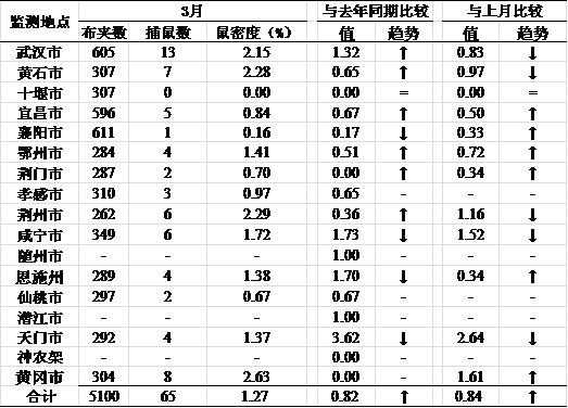 本月鼠密度监测结果显示,黄冈市最高(2.63%),其次是荆州市。本月与去年同期及上月各市(州)鼠密度监测结果比较情况见表3。