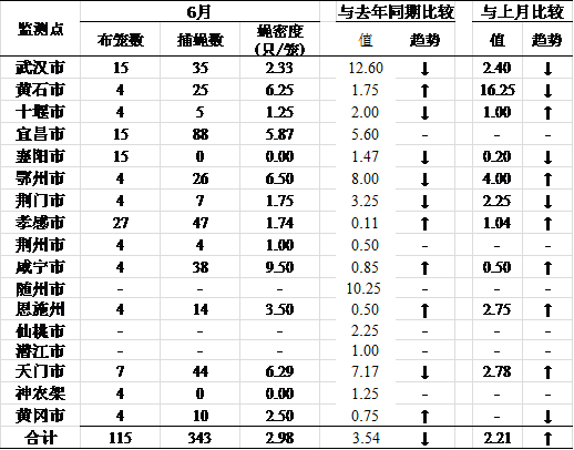 本月蚊密度监测结果显示,武汉市最高为(29.37只/灯·时),其次是天门市。本月各市(州)蚊密度监测结果比较情况见表6。