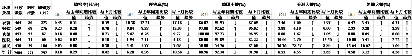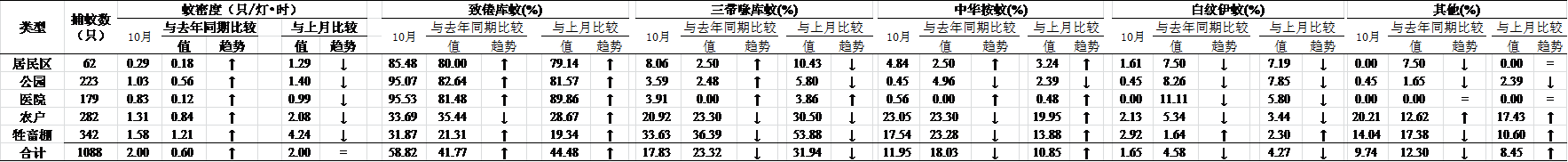 本月病媒生物监测结果显示,全省鼠平均密度为0.94%,与上月及去年同期相比略有升高;所捕获鼠以褐家鼠为主。全省平均蚊密度为2.00只/灯•时,与上月密度水平持平,与去年同期相比有所升高;捕获蚊以致倦库蚊为主。全省平均蝇密度为1.38只/笼,与上月及去年同期相比均有所下降;捕获蝇以家蝇为主。全省蟑平均密度为0.18只/张,平均侵害率6.2%,蟑平均密度、平均侵害率二者与上月及去年同期相比均有所下降;所捕获蟑以德国小蠊为主。