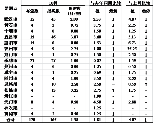 为保证湖北省病媒生物监测工作的顺利开展,有效应对各种虫媒传染病的发生和流行,按照《湖北省病媒生物监测方案》(2013版)要求,全省17个市州开设病媒生物监测点,现将湖北省2016年10月各市(州)开展病媒生物监测情况汇报如下: