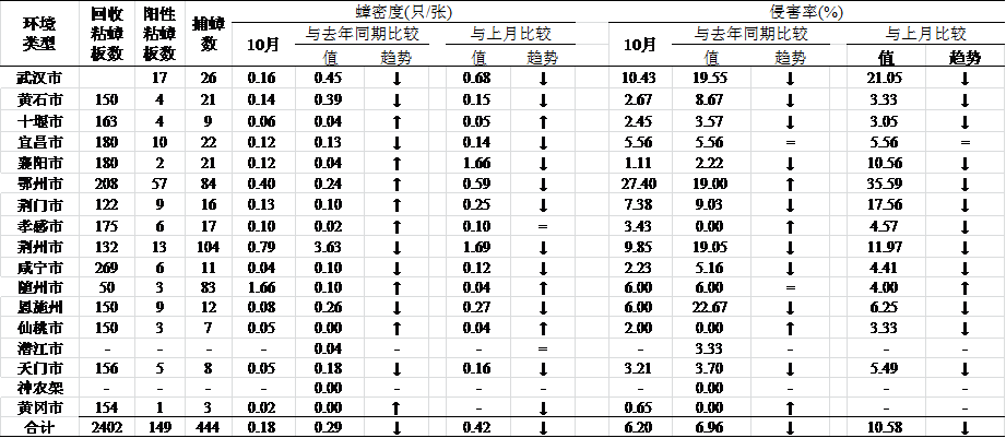 本月蟑密度监测结果显示,随州市最高(1.66只/张),其次是襄阳市;侵害率监测中,鄂州市最高27.4%,其次是武汉市。本月与去年同期及上月各市(州)蟑密度和蟑侵害率监测结果比较情况见表4。