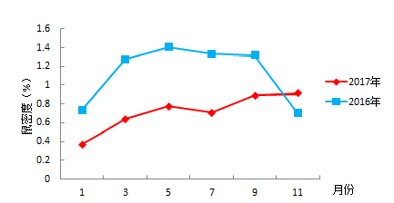 在城镇居民区、特殊行业和农村自然村等不同环境类型设点开展鼠密度监测,从2017年的季节消长趋势看,捕获鼠密度整体呈现上升趋势,在9月、11月密度较高,整体上较2016年的鼠密度偏低(如图1所示)。