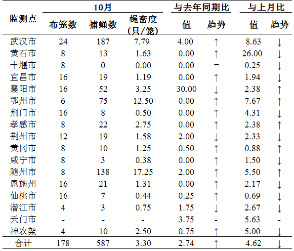 表4 2018年10月湖北省各市(州)病媒生物监测结果—蝇密度