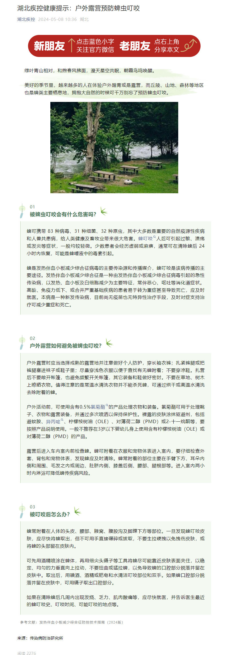 湖北疾控健康提示:户外露营预防蜱虫叮咬