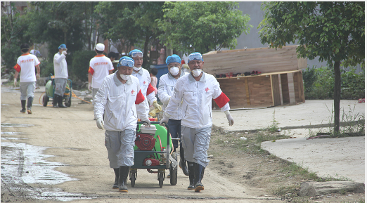 中心副主任徐胜平和梁智辉,2008年曾代表麻城疾控人参加了四川汶川大地震的救灾防疫工作,为灾区人民的健康作出他们应有的贡献。在麻城这场没有硝烟的战斗中,他们又担起了重任,作为应急分队的主干成员,每天辗转于各个灾区处置现场,指导和参与消杀及疾病监测等具体工作。7月6日由他们带领的卫生应急二分队前往宋家河村养殖厂。还未靠近养殖厂,一阵阵恶臭扑鼻而来,现场更是一片狼藉,随处可见的人畜粪便、生活垃圾,污水四溢,苍蝇蚊子满天飞….尽管环境如此恶劣,他们丝毫没有犹豫,没有退缩,迅速明确分工,由董少波主任负责药水的配制工作,其余同志密切配合按区域分片开展现场消杀。村里没有自来水,他们就推着笨重的消杀车、背着沉沉的喷雾器来到河边用水桶取水完成消毒剂配制工作,然后各行其责对厂区及附近的水井、厕所、房前屋后、垃圾堆等区域进行拉网式喷洒清毒,不放过任何一个卫生死角,坚决把细菌病毒消灭掉。烈日当头,空气中弥散着浓浓的消毒剂熏得人睁不开眼,刺得喉咙如火烧一般,气味令人作呕,但队员们没有一个人叫苦叫累,更没有人想过要退出。由于连续作战,董少波和蔡利平两位同志出现严重的头晕、胸闷、面色苍白、出汗等中暑症状,可经过短暂的休息调整后他们转身投入到消杀战斗中。