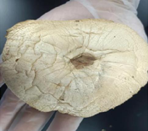 幼时菌盖表皮暗褐色或浅褐色,逐渐裂为鳞片,顶部鳞片大而厚,呈褐紫色,边缘渐少或脱落。
