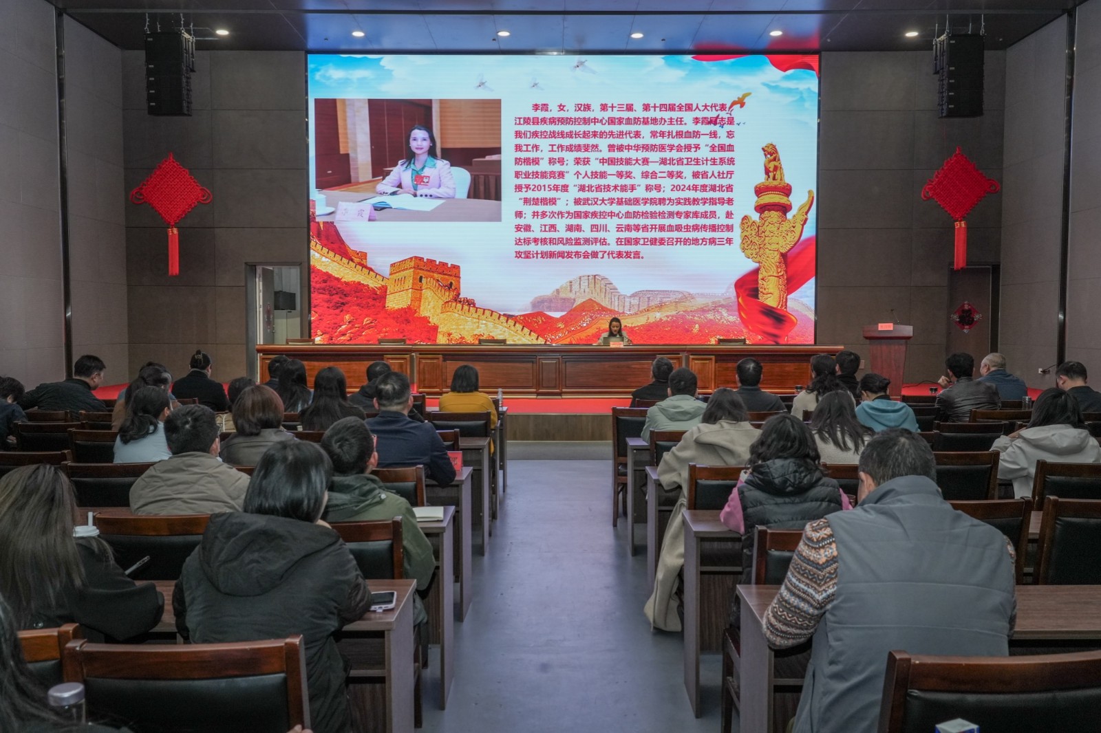 李霞是第十三届、第十四届全国人大代表,江陵县疾病预防控制中心国家血防基地办主任。李霞从全国两会概况、全国两会精神、湖北代表团活动情况、个人履职情况四个方面作了宣讲报告。全国两会于2025年3月5日至11日在北京举行,近3000名全国人大代表出席会议,在7天的会期里,圆满完成了7项议程。大会期间,习近平总书记先后参加了江苏代表团审议,看望了民盟、民进、教育界委员,并参加联组会,出席了解放军和武警部队代表团全体会议,发表了一系列重要讲话,深刻阐释了事关我国发展战略和全局的一系列重大问题,为推动中国式现代化迈出新的坚实步伐,指明了前进方向、提供了根本遵循。李霞代表两会期间认真履职,积极建言献策,提交了《关于积极推进动态增加国家免疫规划疫苗种类的建议》等8份建议,为湖北和荆州加强支点建设、实现高质量发展提出了宝贵建议。深入学习贯彻全国两会精神和习近平总书记重要讲话精神,是当前和今后一个时期的重要政治任务。