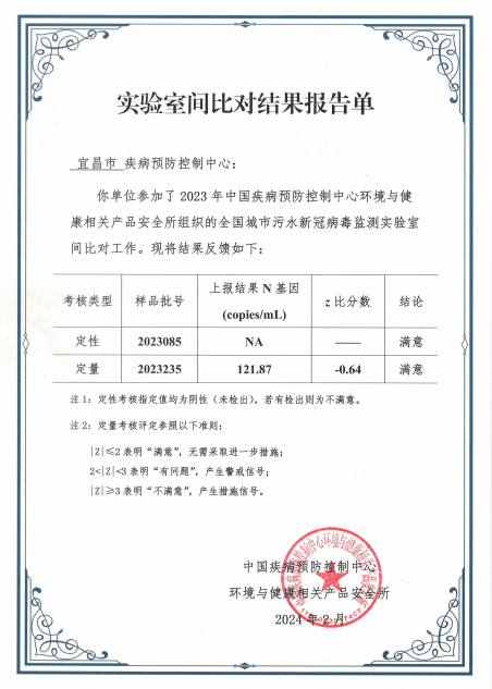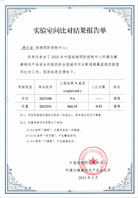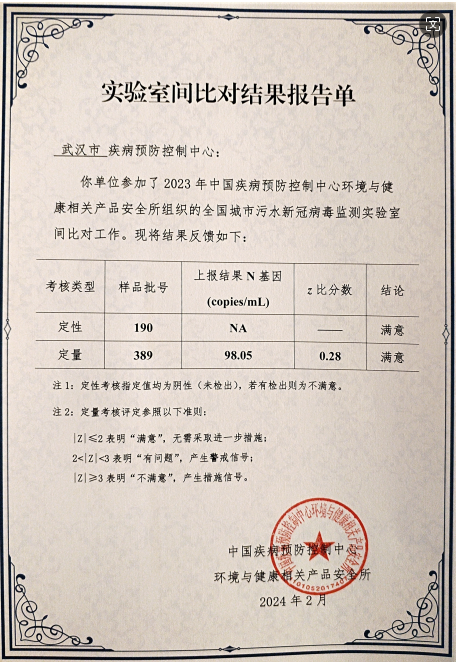 为提高污水新冠病毒监测数据的准确性和可靠性,受国家疾病预防控制局委托,中国疾病预防控制中心环境与健康相关产品安全所于2023年底组织开展了城市污水新冠病毒监测实验室间比对工作。本中心和武汉市疾病预防控制中心、宜昌市疾病预防控制中心按要求参加了此次实验室间比对工作。