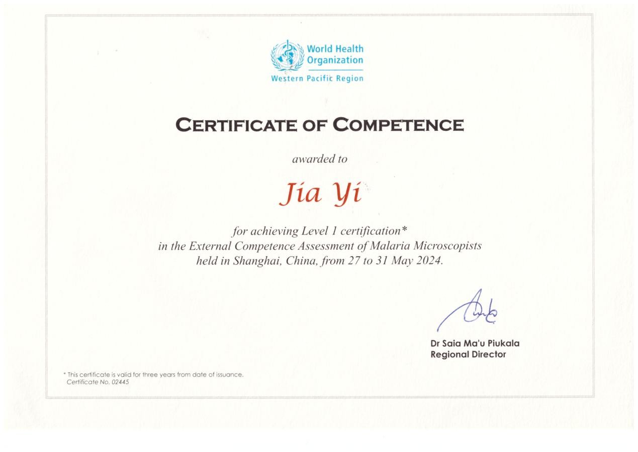 2024年5月27日-31日,世界卫生组织(WHO)在上海对中国疟疾镜检专家进行的能力评估认证。血吸虫病防治研究所的易佳同志作为中国选派的12名镜检专家之一,进行了为期5天的考核评估,并以优异成绩荣获WHO疟疾镜检能力一级水平认可,取得WHO疟疾镜检能力一级最高资质资格。一级水平证书在全球范围内认可通用,目前我省是首次获得一级水平证书。