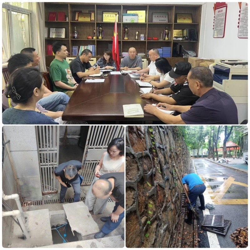 面对雨情考验,总务后勤处与物业团队展现高效应对。在屋顶平台,工作人员顶风冒雨排查积水,凭借丰富经验精准定位渗漏隐患。排水管道疏通是重点任务,尤其在绿植密集区域,员工徒手清理堵塞渠口的落叶杂物——有人俯身掏挖障碍,有人直接伸手探入浑浊积水中,确保关键排水路径畅通无阻。
