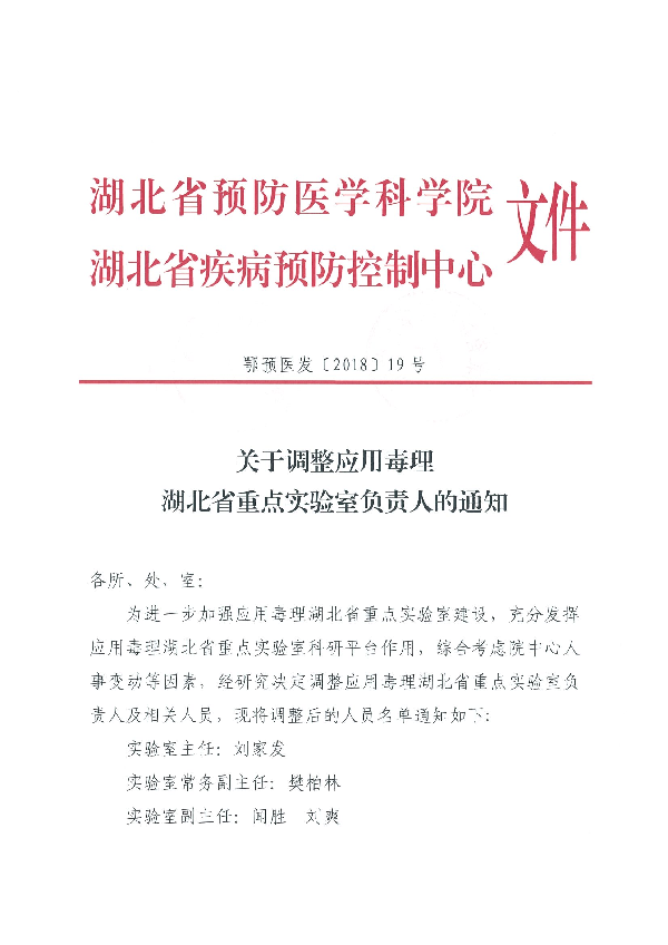 关于调整应用毒理学湖北省重点实验室负责人的通知